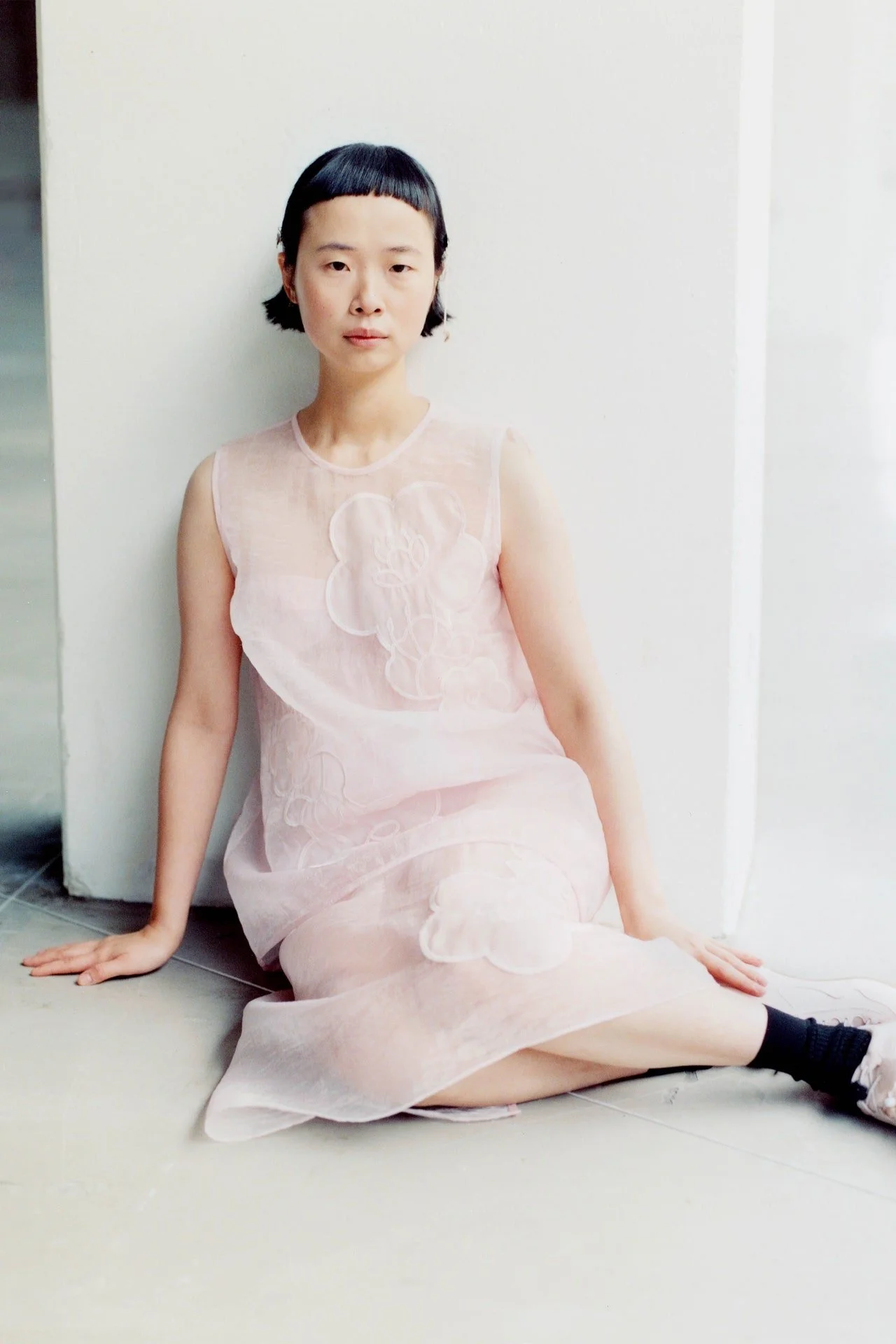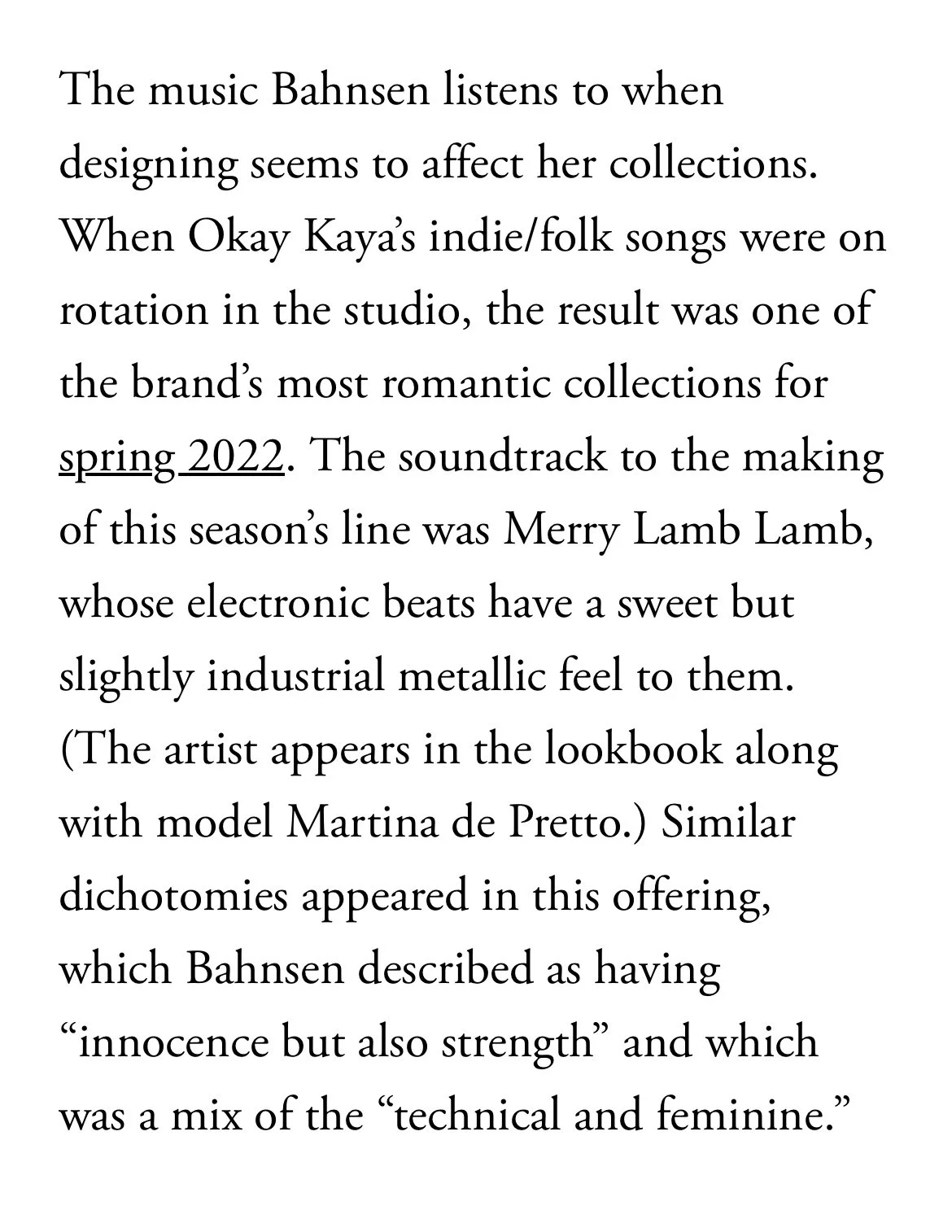 The music Bahnsen listens to when designing seems to affect her collections. When Okay Kaya’s indie/folk songs were on rotation in the studio, the result was one of the brand’s most romantic collections for spring 2022. The soundtrack to the making of this season’s line was Merry Lamb Lamb, whose electronic beats have a sweet but slightly industrial metallic feel to them. (The artist appears in the lookbook along with model Martina de Pretto.) Similar dichotomies appeared in this offering, which Bahnsen described as having “innocence but also strength” and which was a mix of the “technical and feminine.”