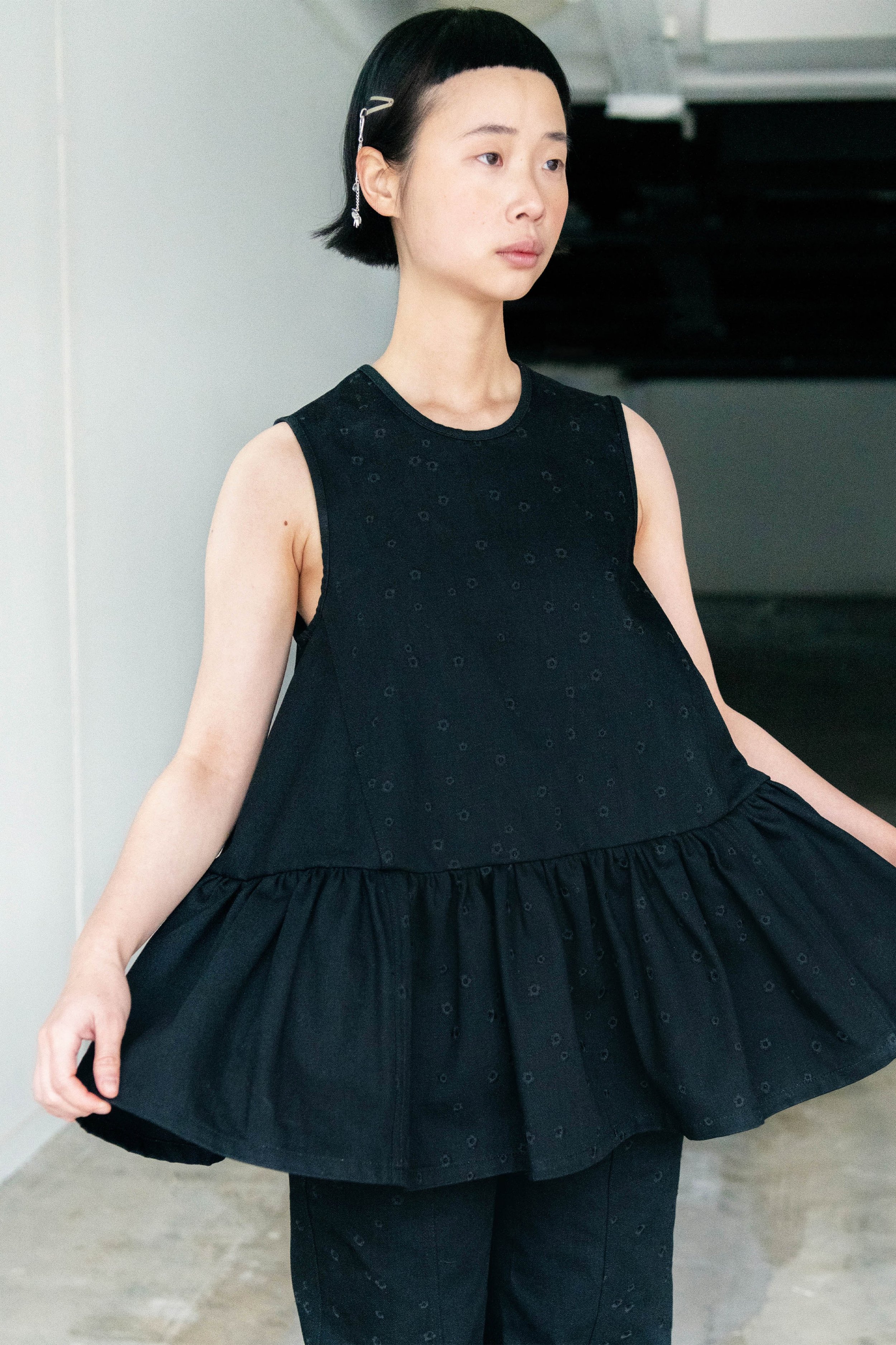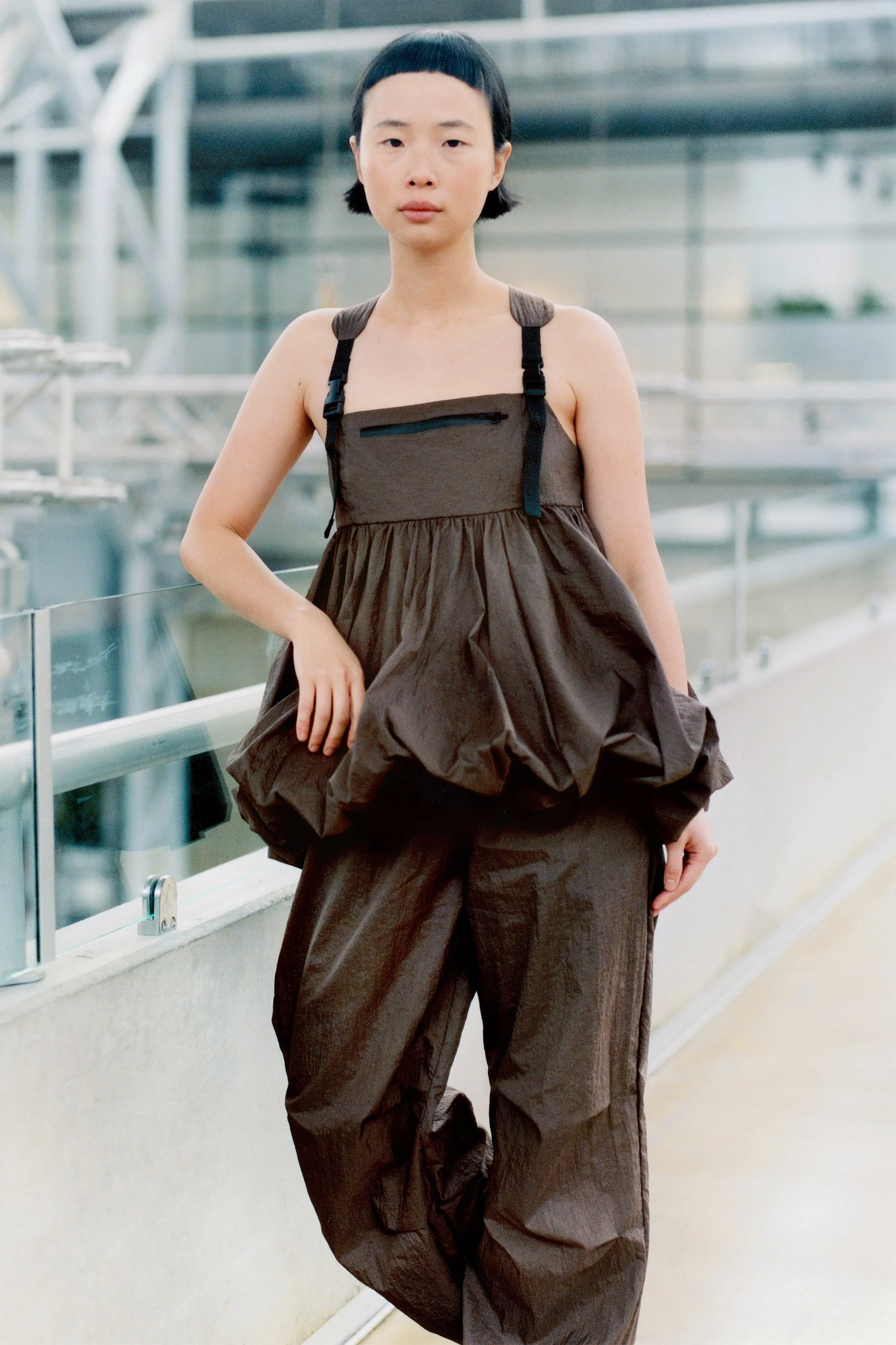 Sporty elements came via Bahnsen’s past collaborations with Asics and, last season, with North Face. (This collection introduced a new pair-up, with the Japanese bag brand Porter.) Bahnsen carried some of these techy touches forward, as she said, into her world. Backpack-like straps read like harder-edged harnesses on dresses with voluminous upside-down baking cup-like silhouettes. Bahnsen also made good use of nylon (which is like the taffeta of technical fabrics) to different effects: A semi-sheer nylon used for lingerie-like separates had an almost waxy look, while a crisper fabric was used for a curved-back hooded coat that would be perfect for cycling around Copenhagen. These materials looked right at home among the jacquards, fil coupés and organzas that are Bahnsen’s signatures. The designer introduced denim in 2023, and there was a raw denim set (trim, cropped jacket, mini rah-rah skirt) in the offering. Bahnsen described the palette—leaf brown, army green, and black, added to pink and cream—as Nordic, and she highlighted the everyday functionality of many of the pieces, which is also common in fashions of the region.